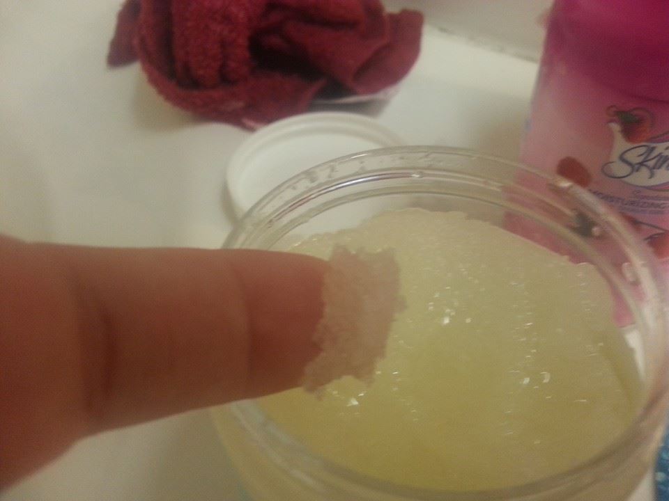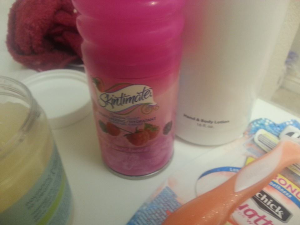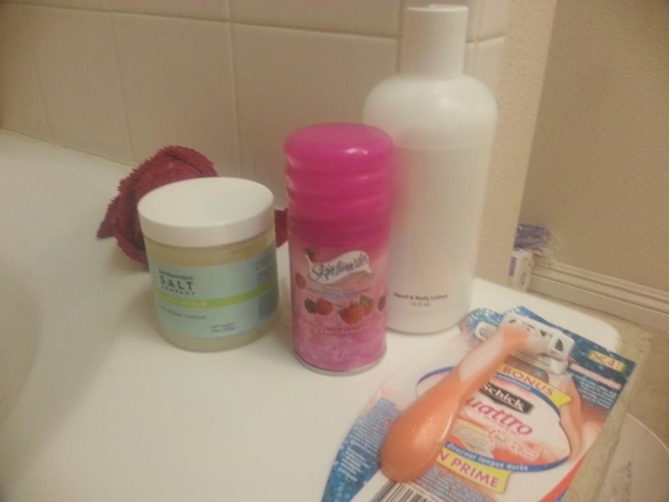 We first got all of our legs nice and wet and then used the salt scrub…It felt really good getting rid of the dead skin. My legs were really soft after using the scrub. We got our legs wet again and put the shaving cream on. It went on as Gel and then foamed up. I think I didn’t put enough shaving gel as I still got knicks in my skin. Although after putting the lotion on my legs feel great.