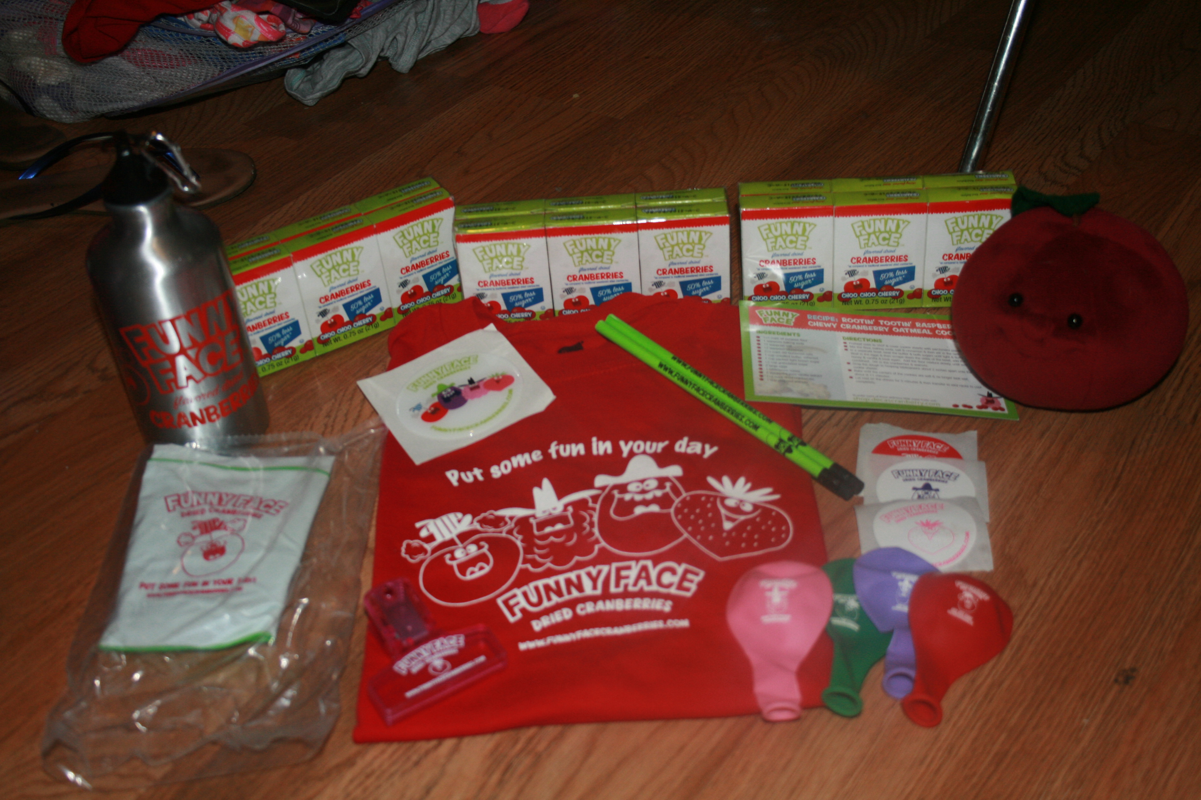 I have always loved dried cranberries. I was so excited that I would be able to introduce it to Chelsea. So far its been a big hit. Funny Face Cranberries sent Chelsea several different goodies. She has really been enjoying the snacks they sent her. She even named her stuffed animal Cranberry “Mina”. She is always naming her stuffed animals and baby dolls. She just loves the stickers, balloons, t-shirt and pencils. I love the clip for closing up bags. These would be great stocking stuffers for anyone looking for healthy alternatives.