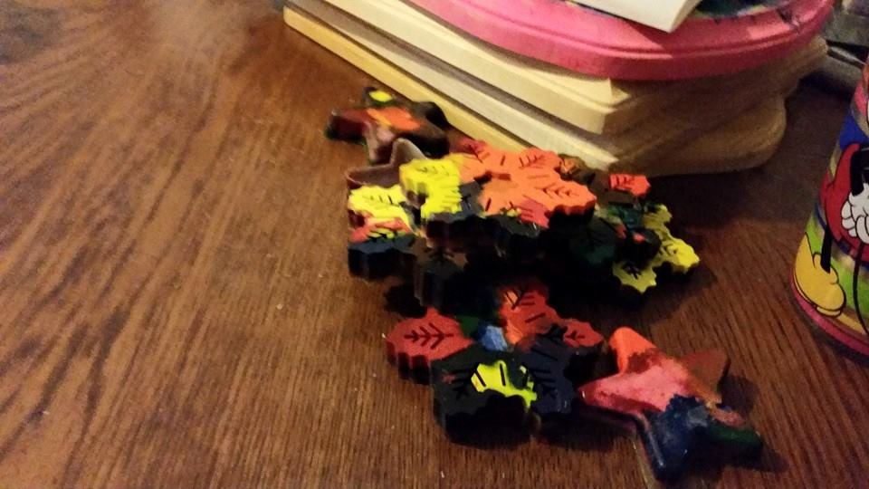 Next we started peeling off all of the paper that was remaining on the crayons. We then broke them into smaller pieces and put them in the cupcake pans. We used silicone pans that we have been using for other crafts. I wouldn’t suggest using one that you plan on making food in it again as the crayons do stain them and even stick to the pans a bit.