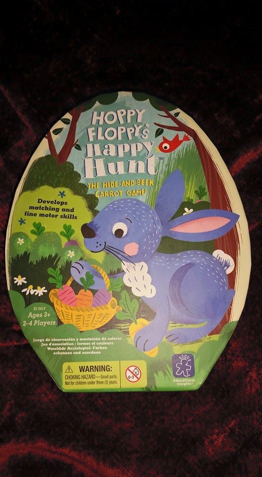 Chelsea just adores this game. She keeps asking to play the “bunny carrot game”. She had so much playing this game. She hasn’t completed grasped how to use the bunny when grabbing the carrots. We have played it a few times already. This game is a perfect edition to any young ones Easter basket. I love that she is playing a game and learning her colors at the same time. She is learning that it is more fun when you take turns.