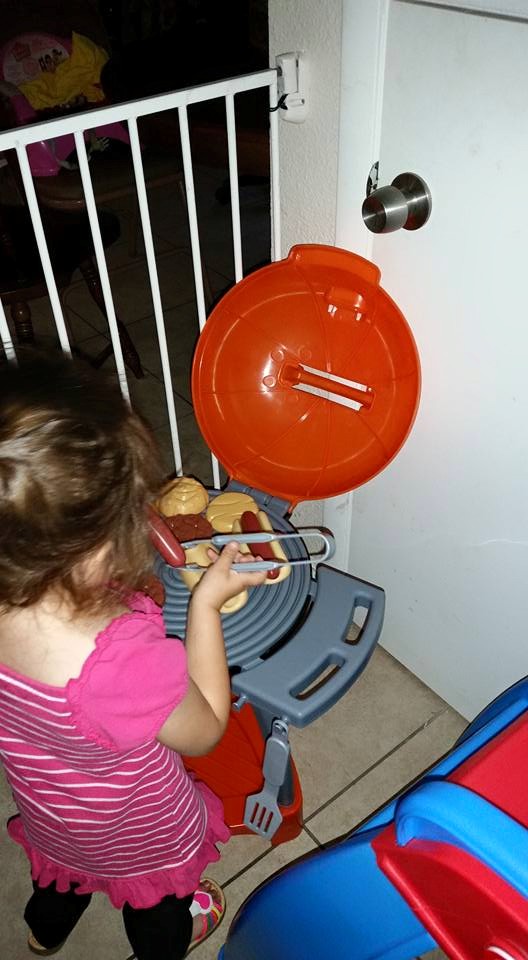 Little Tikes has also been a big part of our daily play time. Their brand has always been know for long lasting toys and children’s products. Today we will be sharing with you about one of their latest toys the Sizzle & Serve Grill. I just love the fact that it wheels. Chelsea has been rolling it around everywhere in the house and outside. She loves staying by her mommy or daddy and playing in the same room as us. She loves pretending to cook so this toy has really been a big hit for her. She has been using the hot dogs and burgers that were included with the grill as well as her other food from previous sets she has had. She loves pretending she is making different dishes.