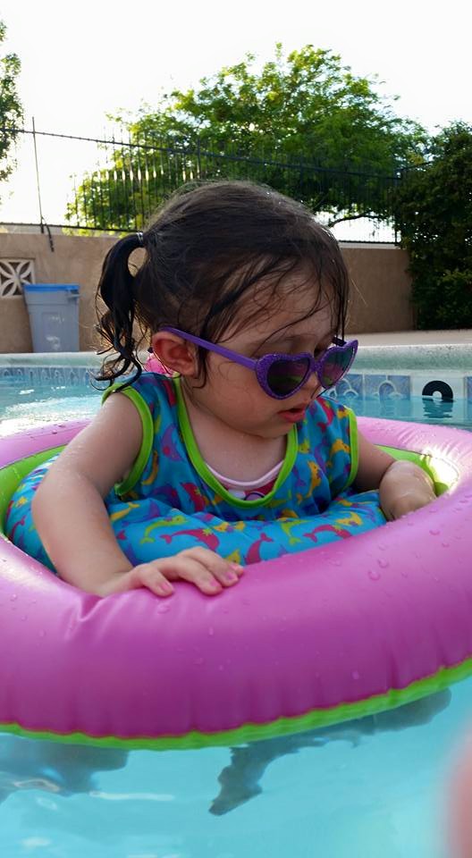 Chelsea really enjoys being outdoors and especially playing in the swimming pool. When going to the swimming pool we must reapply sunscreen every 40 minutes to make sure that we are continuously protected from the sun’s damaging rays.
