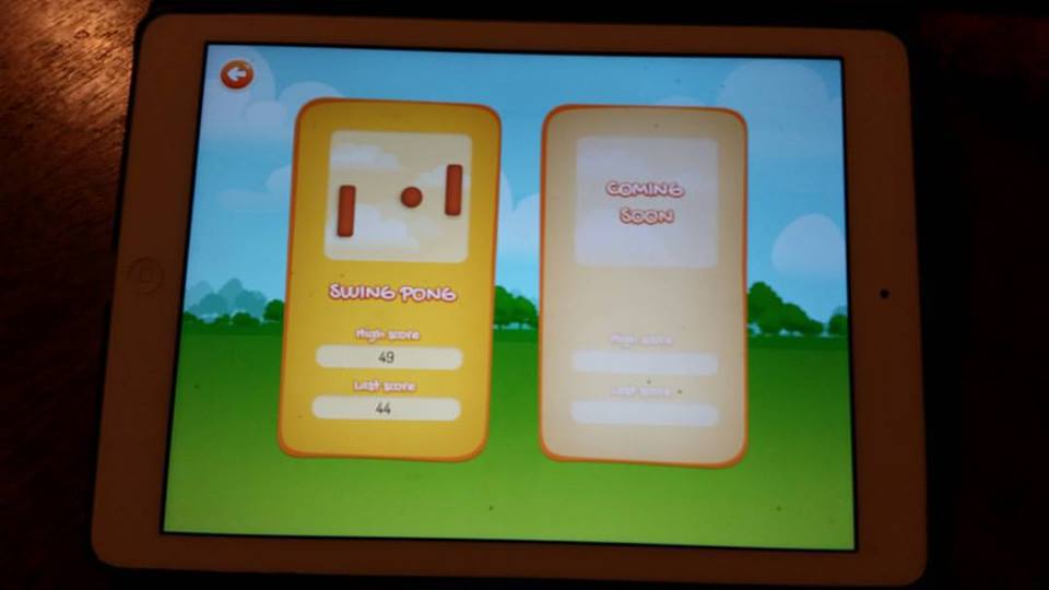 The first game is called Swing Pong. Each sensor controls one of the sliders on the screen. The goal of the game is to keep the ball in play by intercepting it with one of the sliders. Power-ups randomly appear on the screen in the shape of forest fruits and animals. Forest fruits give lives, increase the size of the ball or the sliders, or decrease the speed of the ball. The animals either shrink the ball or the sliders, or increase the speed of the ball.