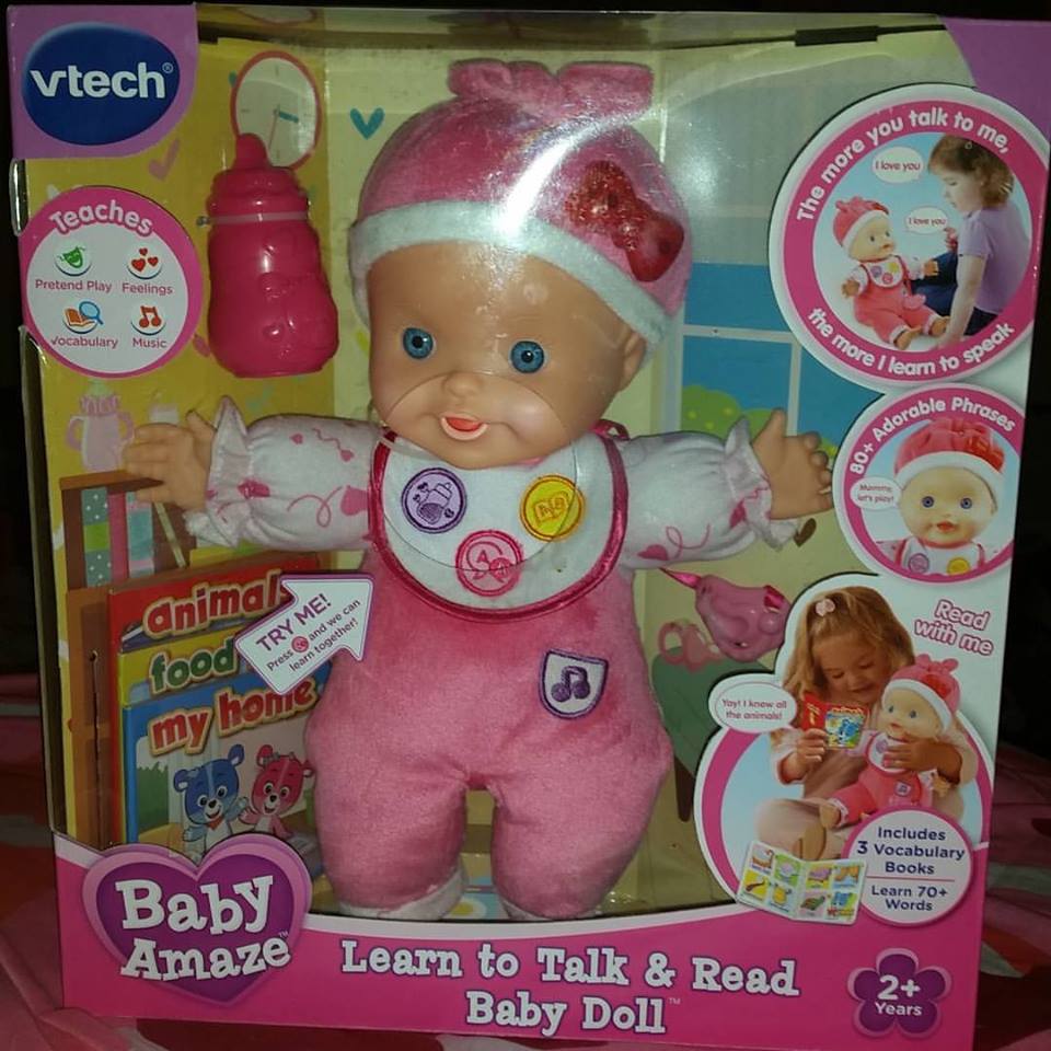 Baby Amaze is a new line that uses technology to teach nurturing concepts and developmental milestones for toddlers whose parents want more from their role-play dolls. Your little one can talk to the VTech Baby Amaze Learn to Talk & Read Baby Doll and hear her repeat what they say or read from the three included vocabulary books featuring more than 70 words about animals, food and household objects. The more your little one talks to the baby doll, the more words and phrases the baby doll will learn and repeat!
